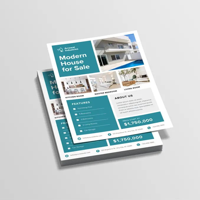 Flyers for independent realtors are an extremely effective but convenient solution to reach new leads. Branded flyers including appealing photos of the house’s exterior, your brand logo and contact details will sure to make lasting impressions. Besides, flyers are easy to read and can be handed out or inserted into mailboxes. Order these professionally designed flyers at an affordable price to grab prospects’ attention instantly. Our full-colour double-sided flyers come in a variety of sizes. Shop now!