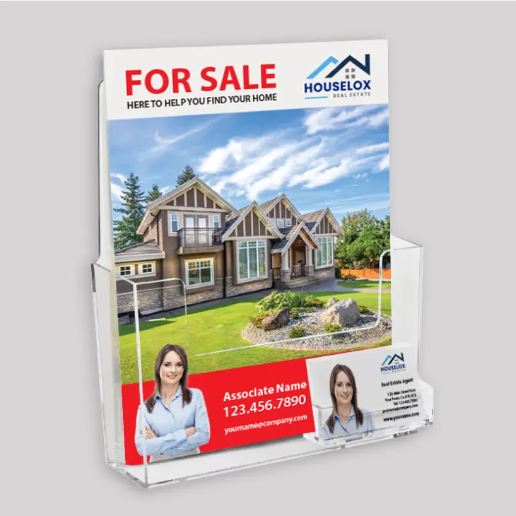 Present your personalized printed materials using our inexpensive, functional Feature Sheet Holder With Business Card Pocket. The product has two pockets. The small pocket holds your custom business cards while the bigger pocket is for feature sheets or other printed materials. Our brochure holders are tough, durable, lightweight, long-lasting and great for distributing your business cards and marketing literature. Agent Print’s real estate brochure holders are of great quality and suit every pocket. Shop at the best prices online!